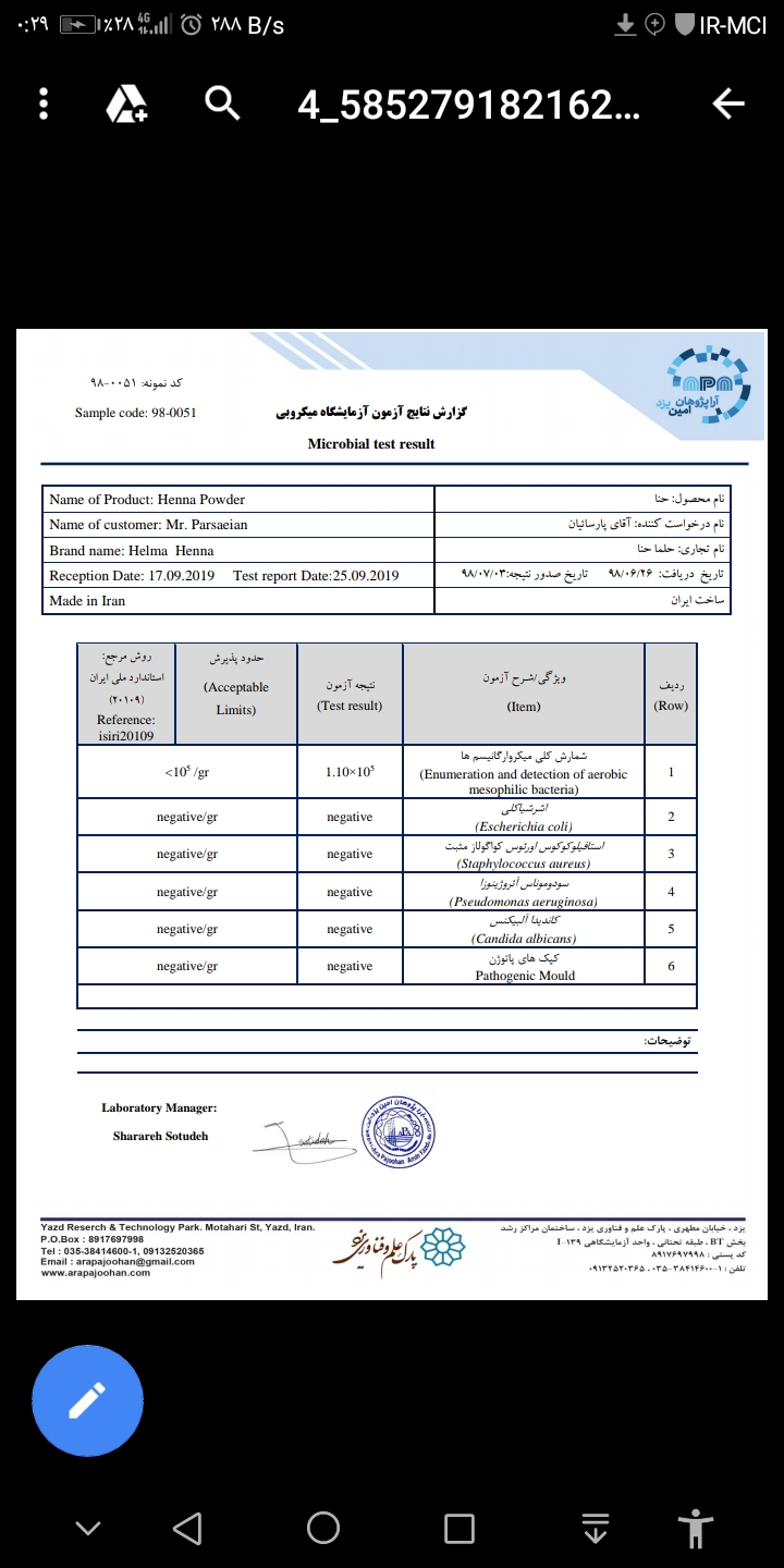 حلما بنابر سفارش مشتریان و بازرگانان محترم، این قابلیت را دارد که حنای ممتاز را در بسته بندی های 100، 200 و400 گرمی قرار داده و از طریقه میزان اشعه استاندارد که توسط مرکز پرتو فرایند یزد انجام می شود، حنای ارگانیک عاری از میکروب بدست مصرف کننده برسد.